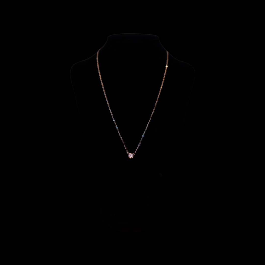 Centered cubic zirconia crystal diamond with a connecting 18” 18k gold necklace with lobster clasp, not adjustable.
