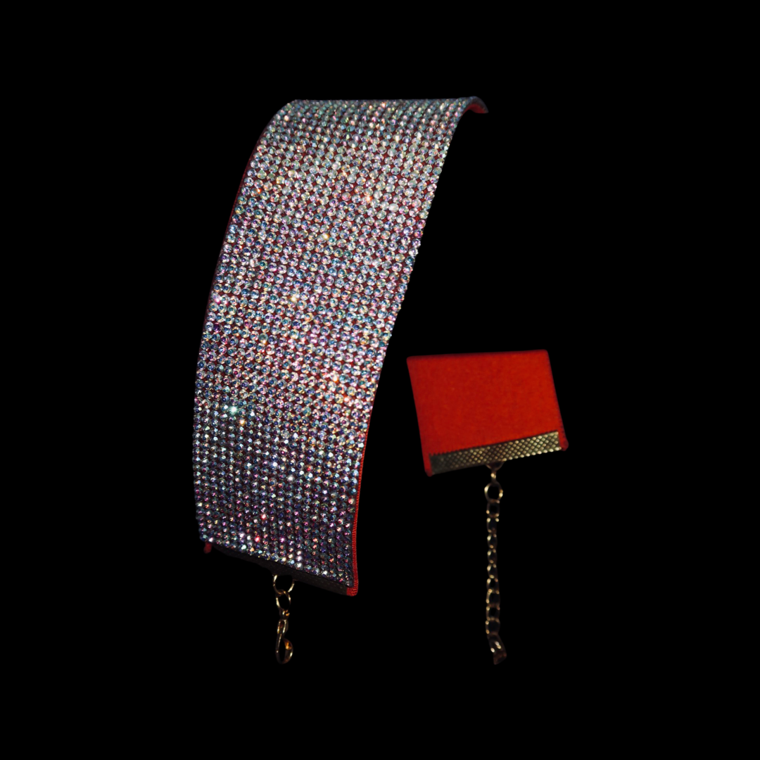 10” in length, 1.5” wide, elastic choker with lobster clasp, closure adjustable by 2”